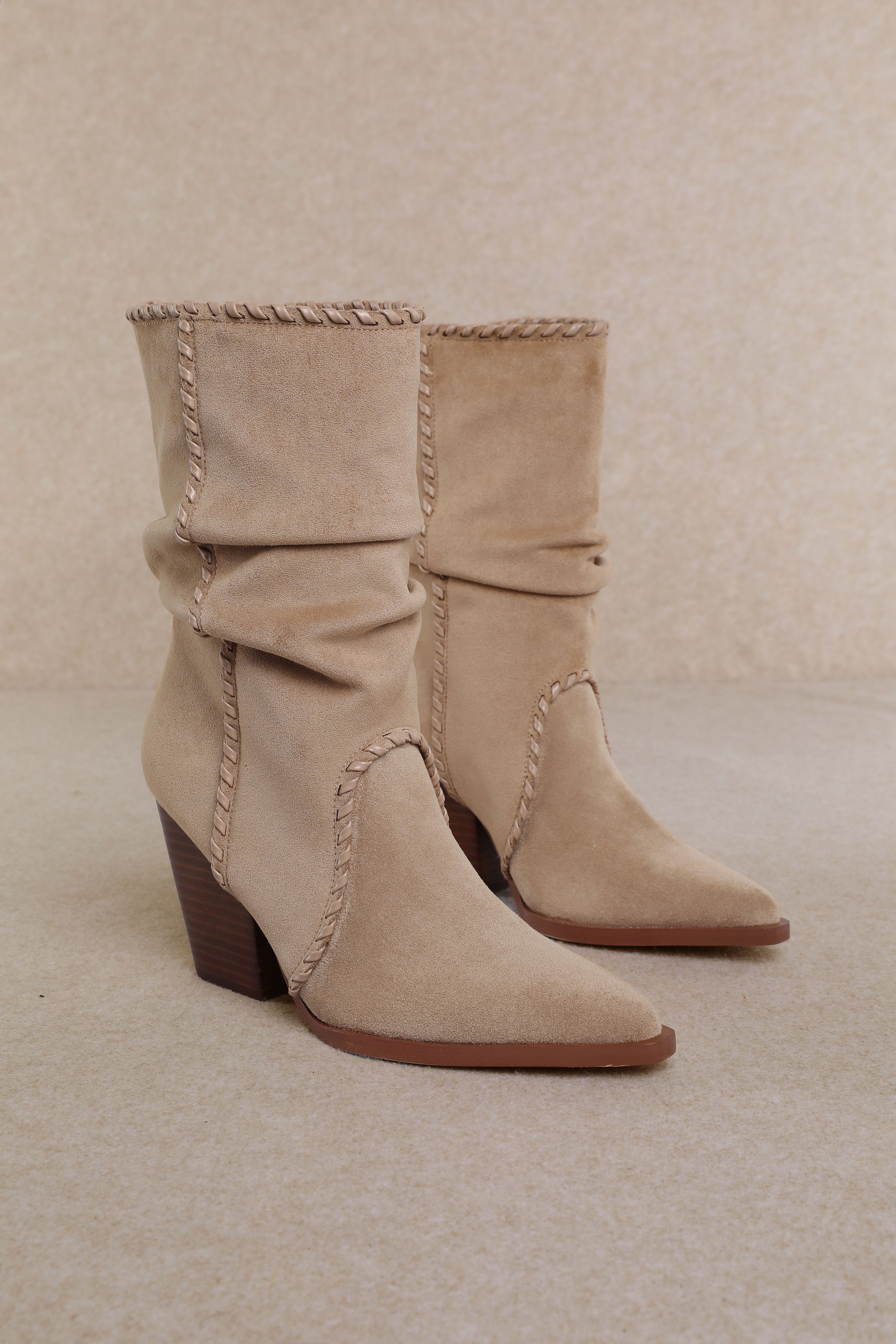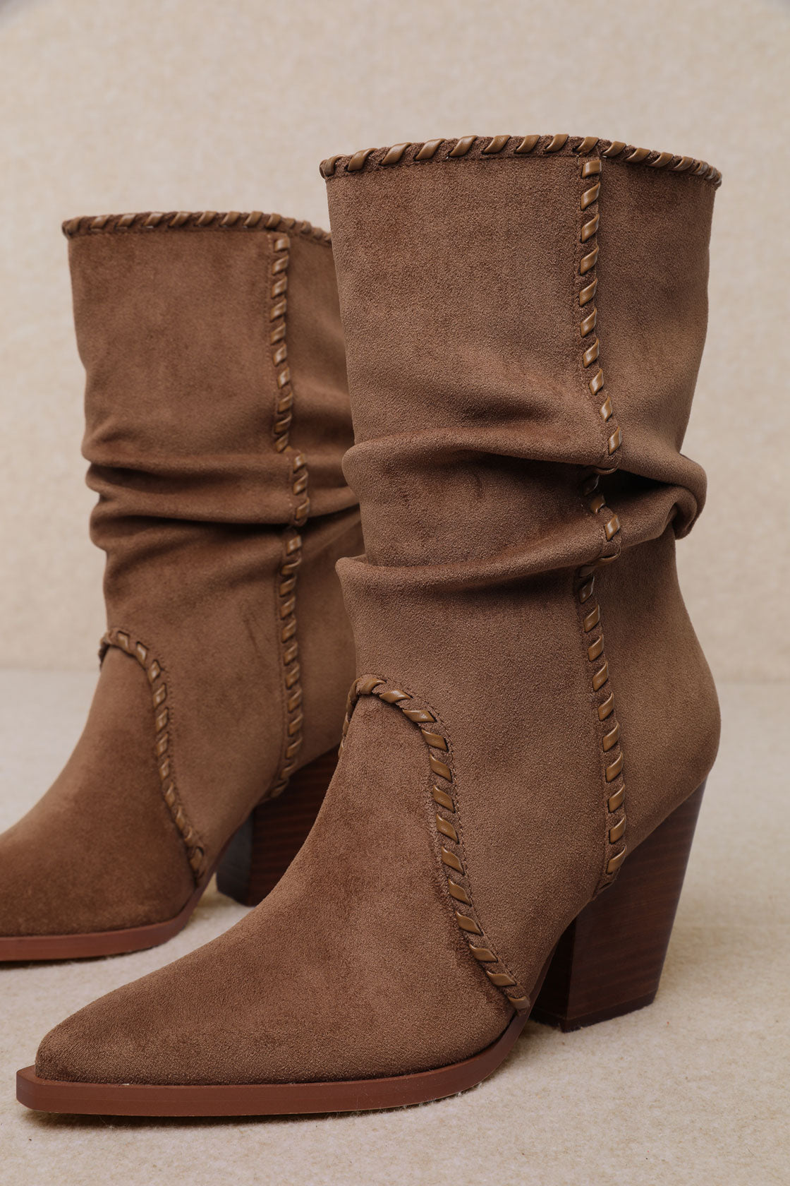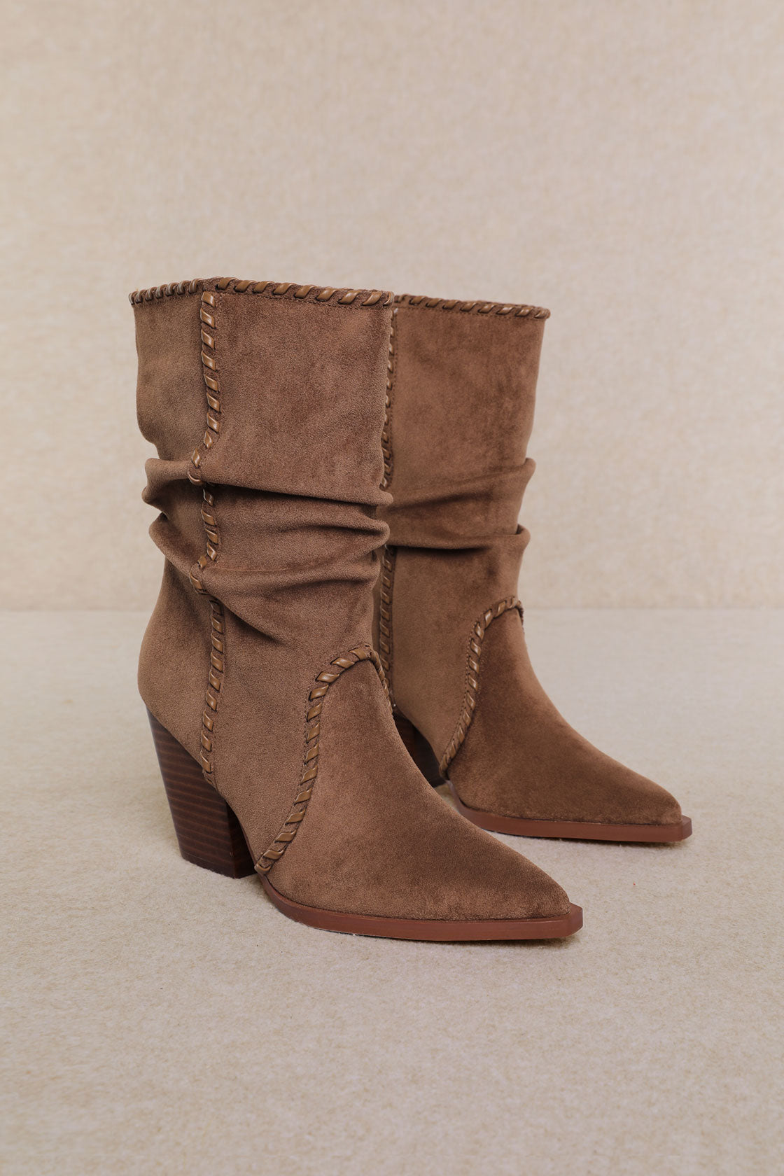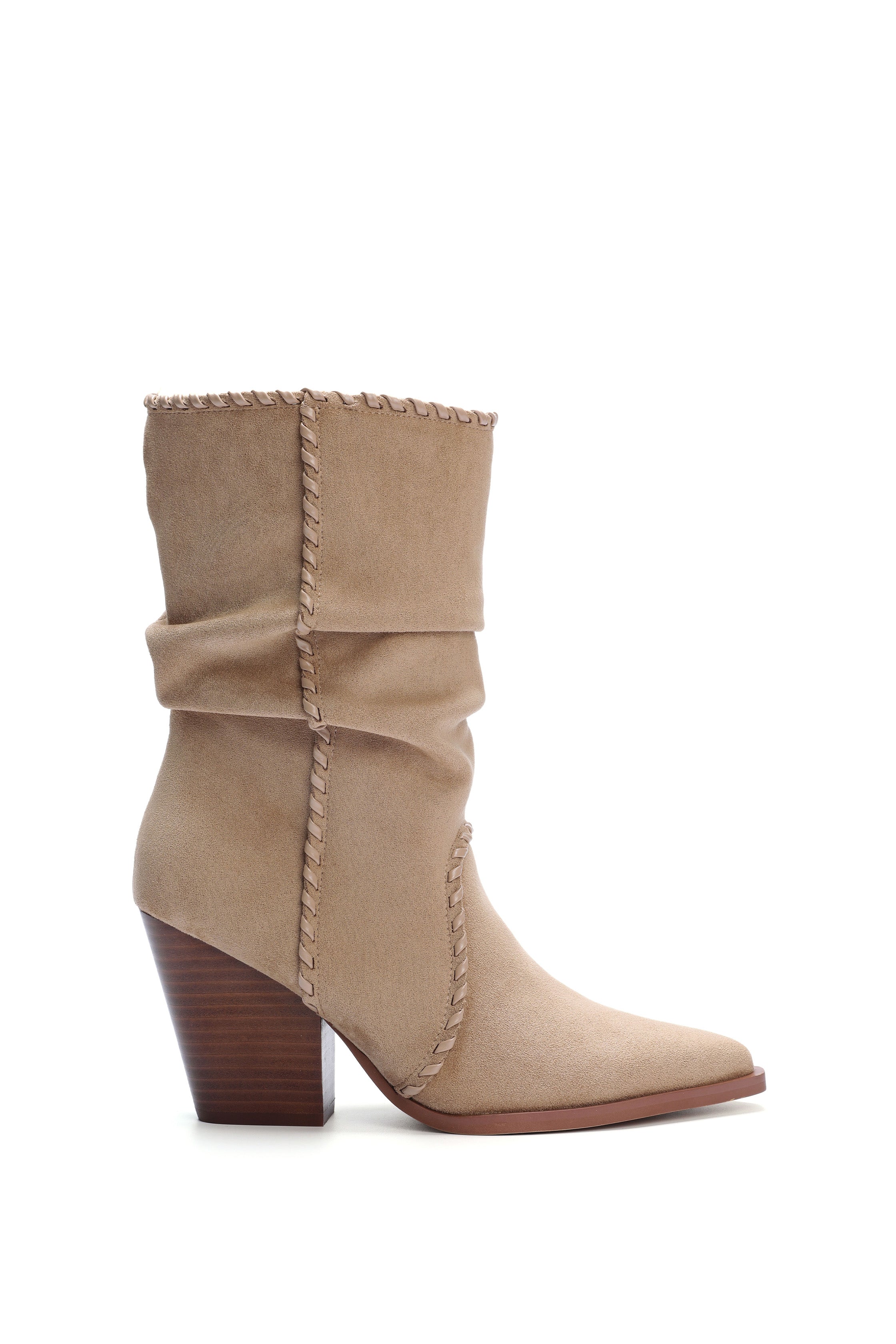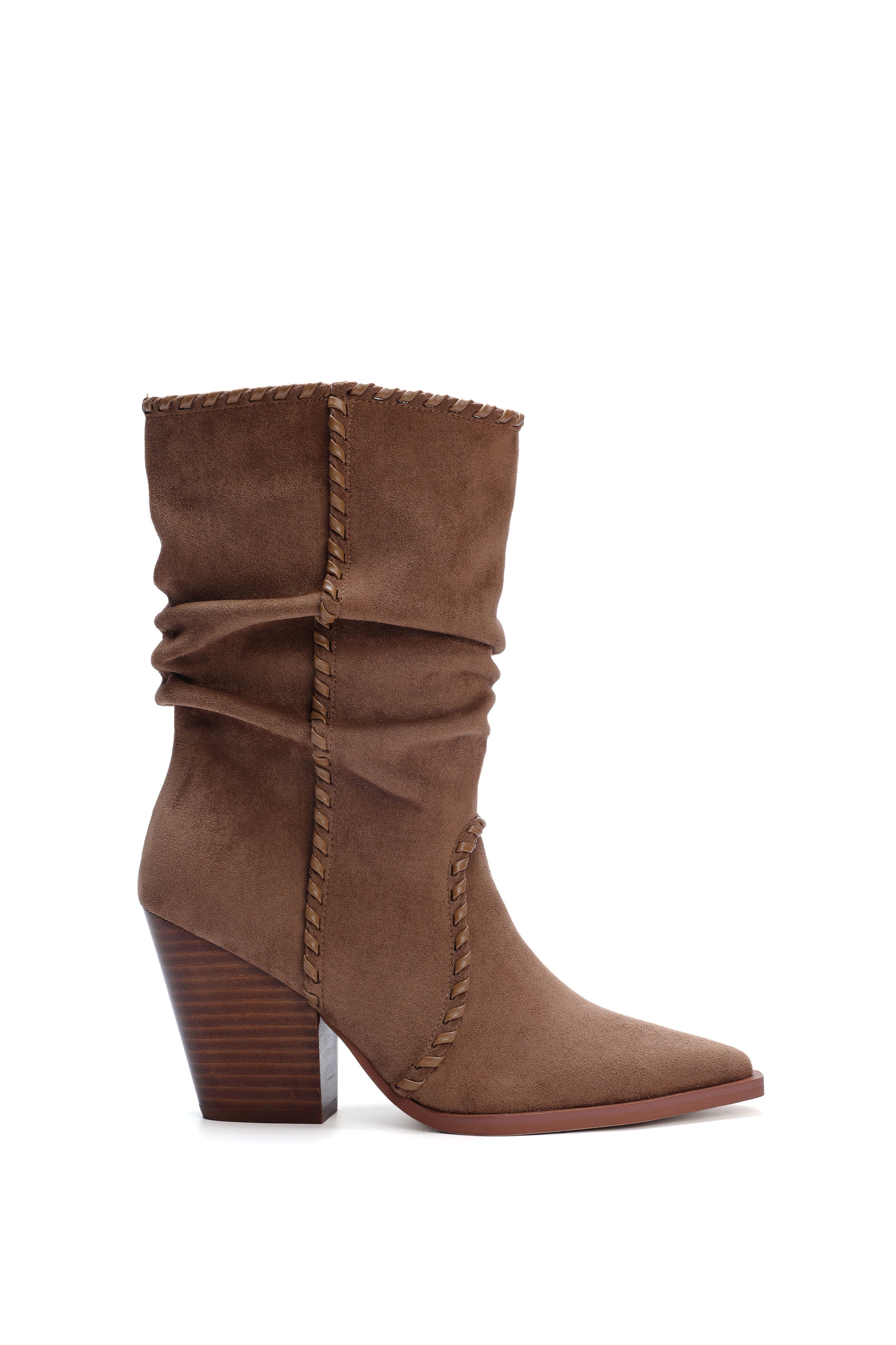 A chic Western-inspired boot designed with a softly slouched shaft, decorative whipstitch trim, and a pointed toe for a relaxed yet elevated look. Finished with a stacked heel and refined silhouette, this style blends effortless comfort with timeless Western charm, perfect for everyday wear or dressed-up styling.