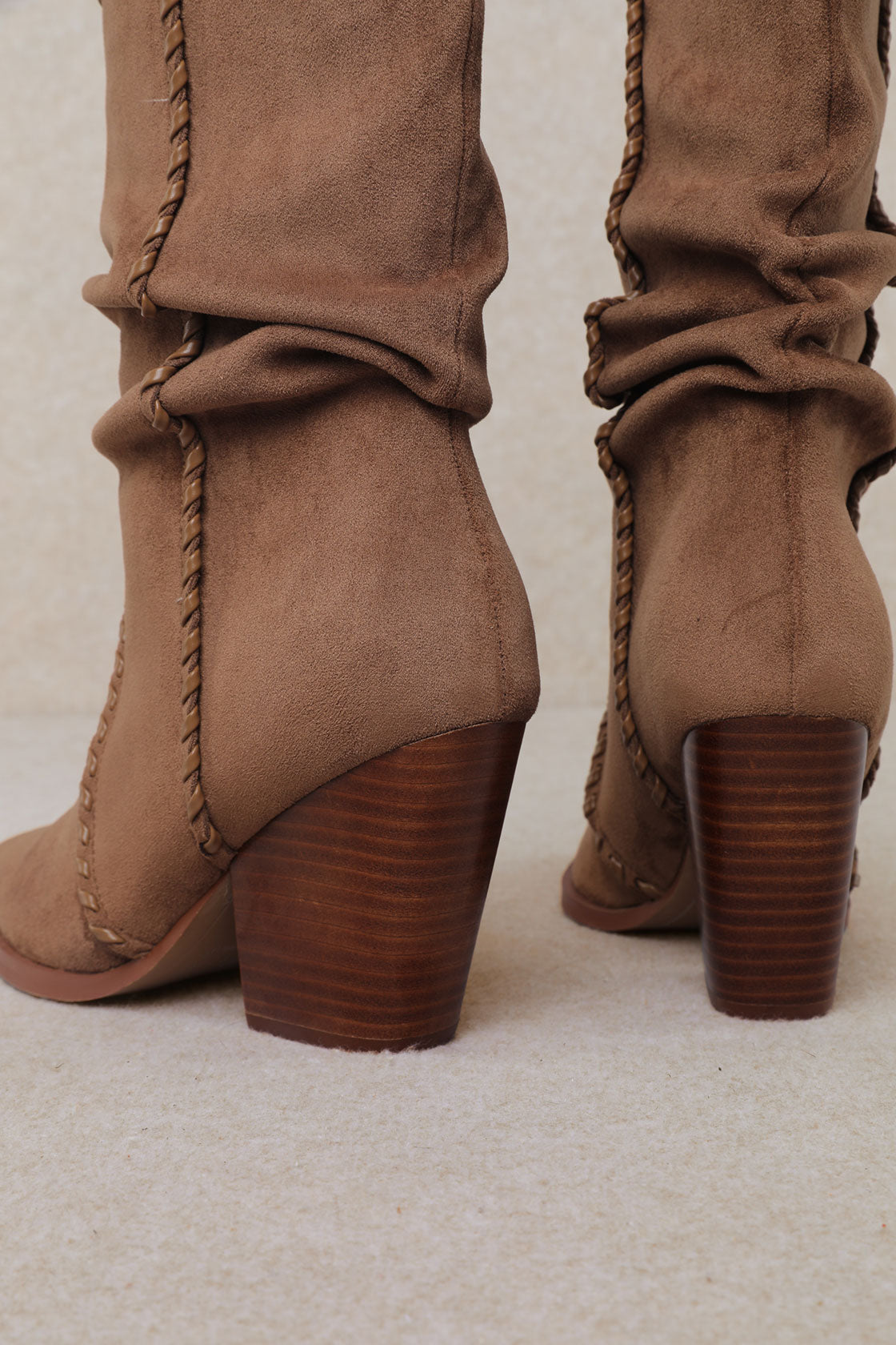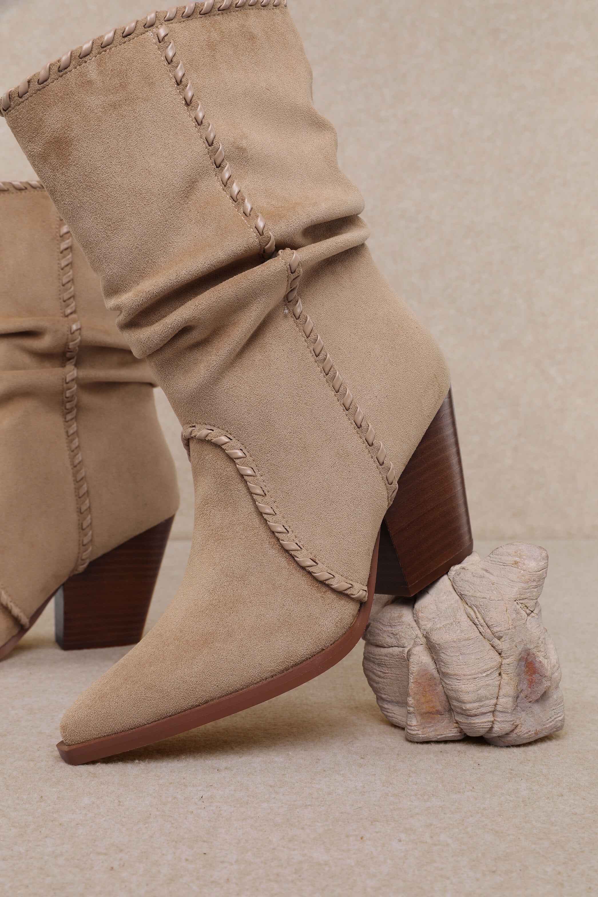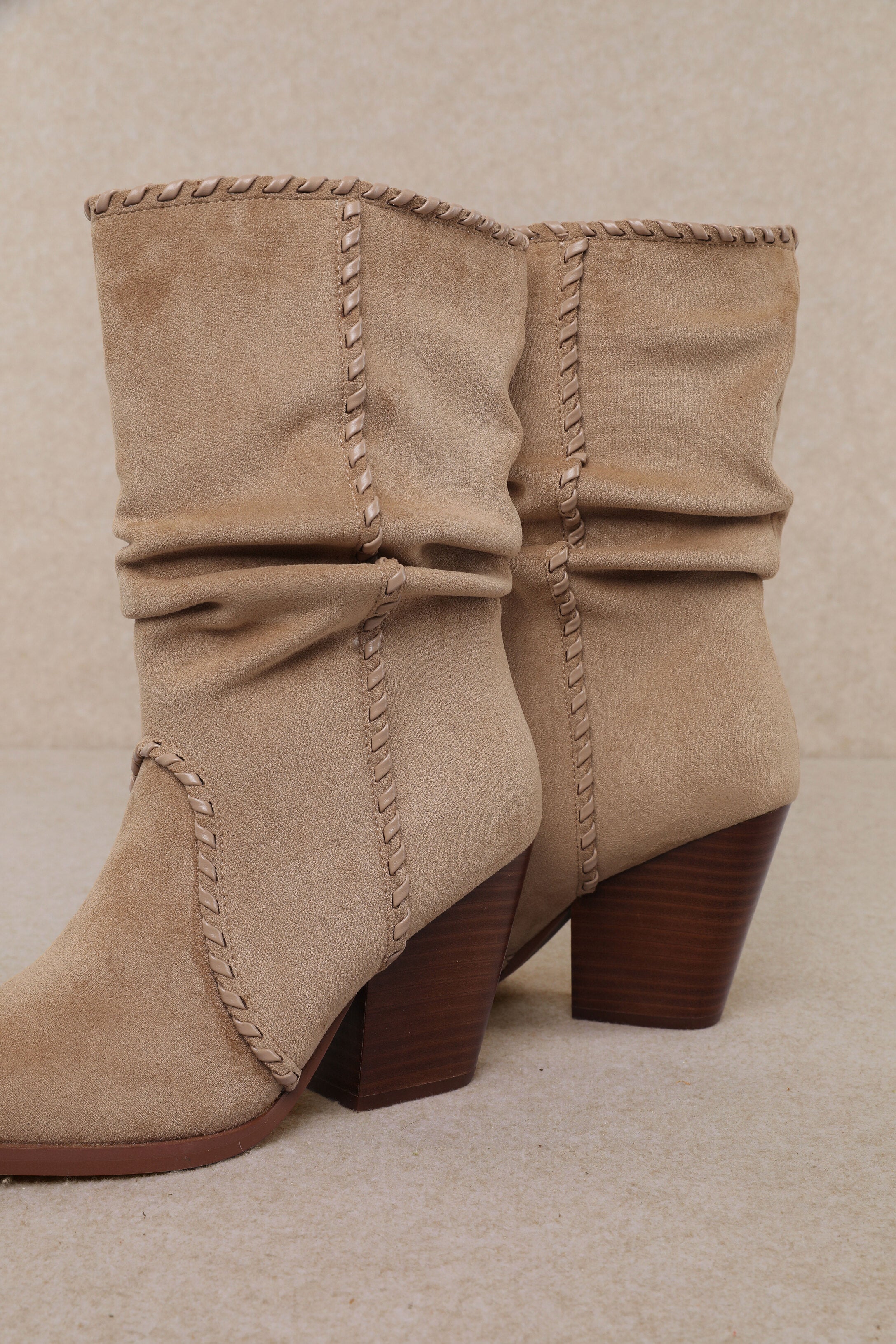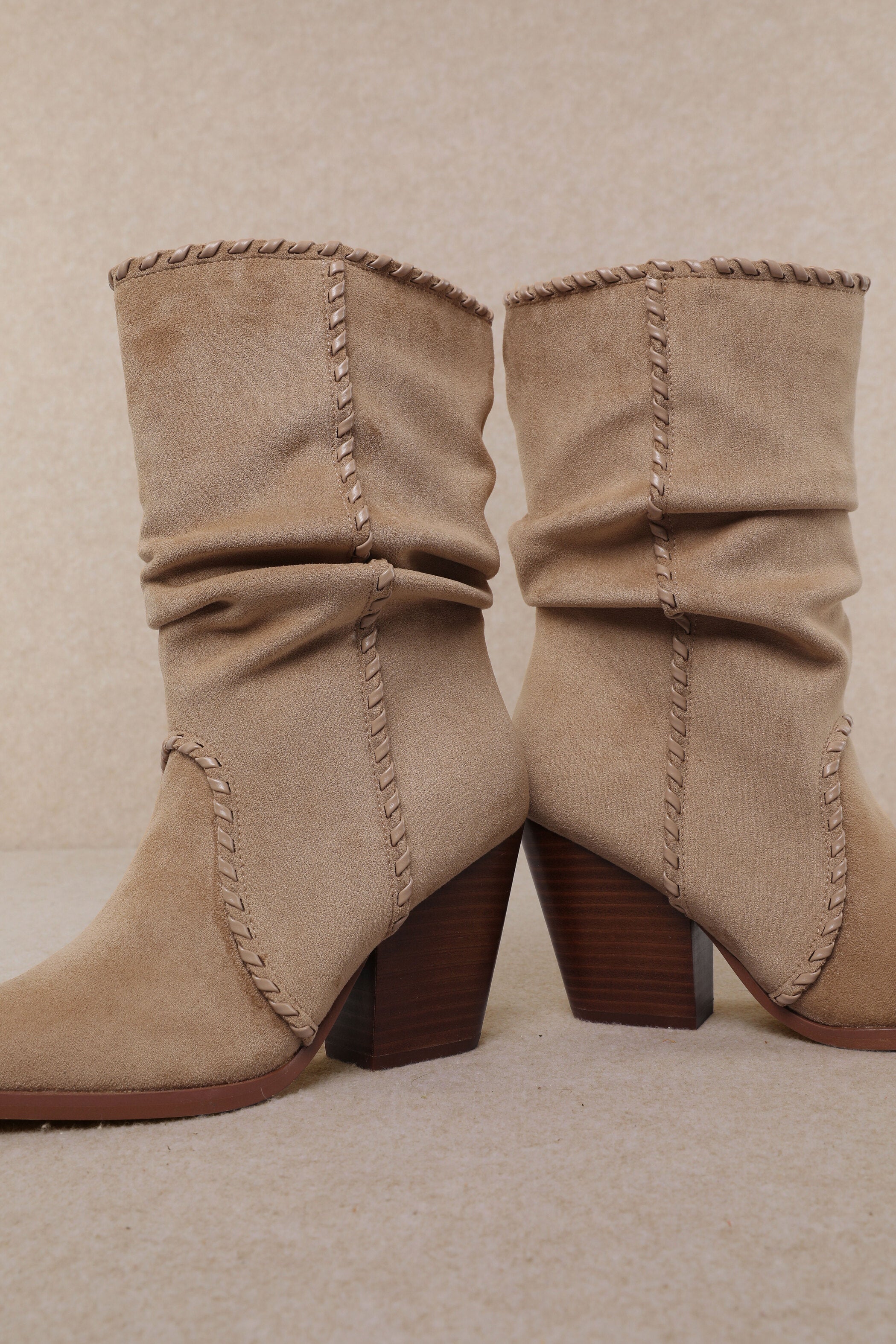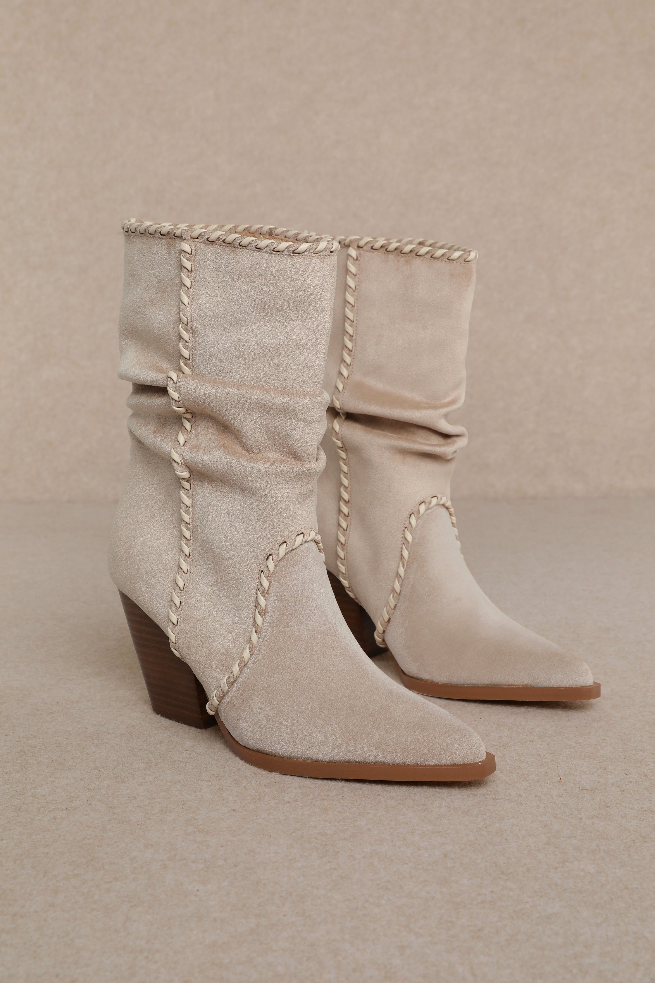 A chic Western-inspired boot designed with a softly slouched shaft, decorative whipstitch trim, and a pointed toe for a relaxed yet elevated look. Finished with a stacked heel and refined silhouette, this style blends effortless comfort with timeless Western charm, perfect for everyday wear or dressed-up styling.