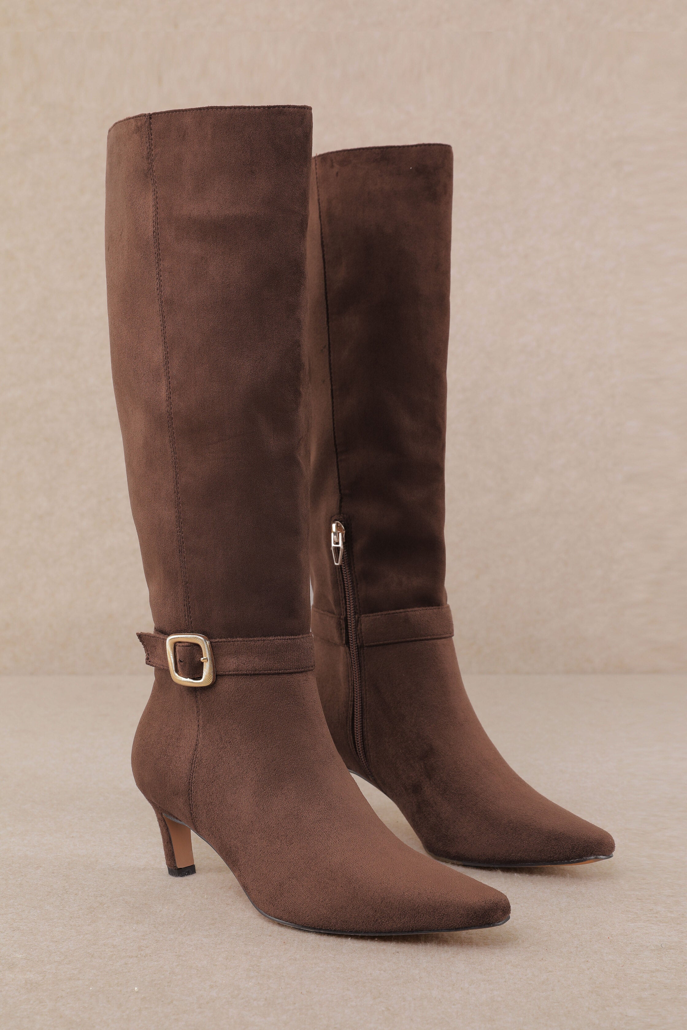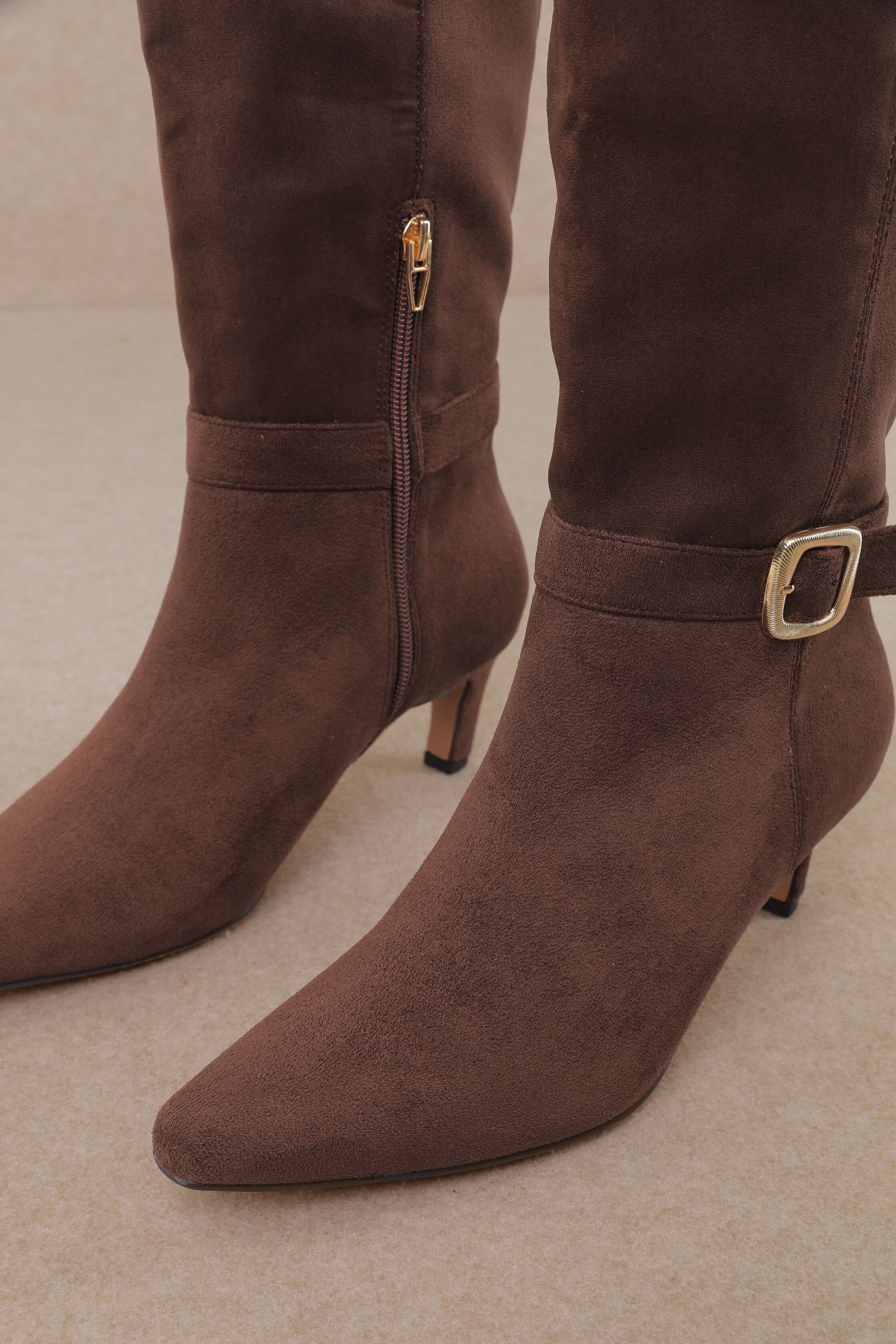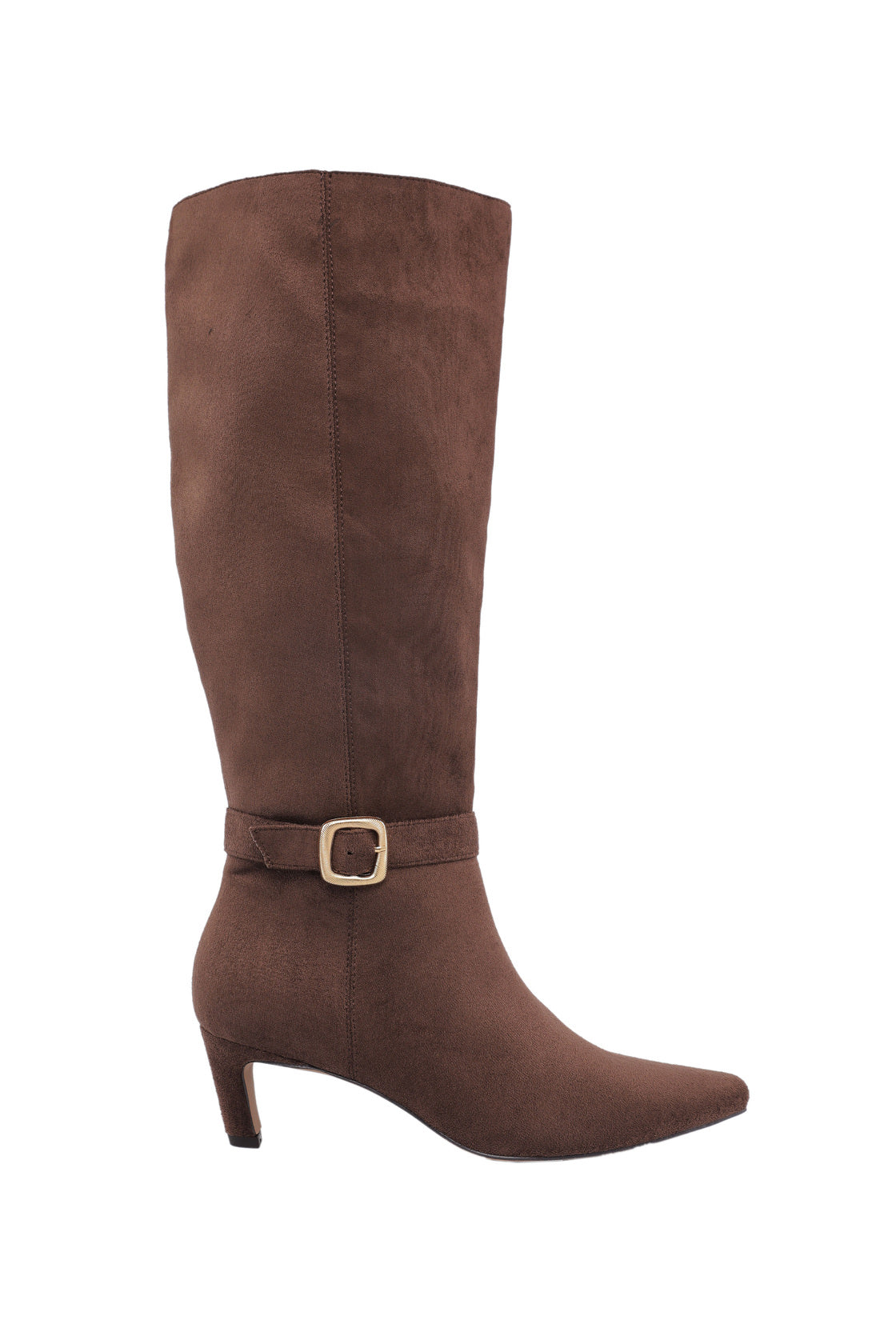 An elegant tall boot designed with a sleek pointed toe, soft textured finish, and a slim heel for a refined silhouette. Featuring a side zipper for easy wear and a delicate buckle accent at the ankle, this style brings polished sophistication to both everyday and elevated looks.