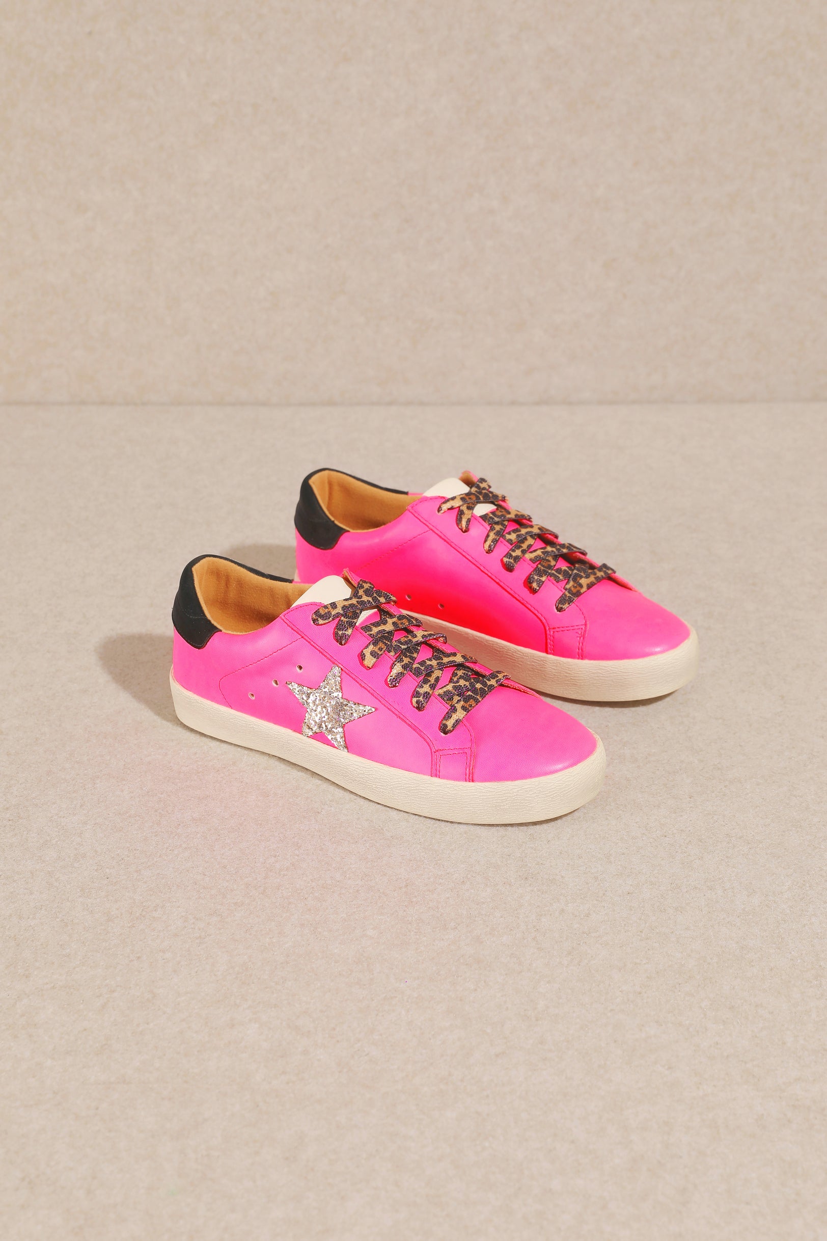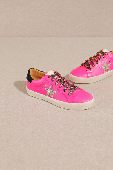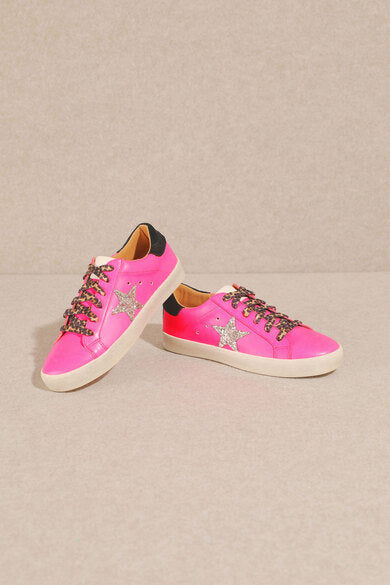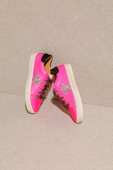 Elevate your everyday style with the SKYLAR - Glitter Star Rhinestone Leather PlatformTrainers. These low-top trainers blend fashion and comfort, featuring soft leather with unique cut-out and stitched glitter stars. Made entirely by hand, they offer a cushioned footbed and strategic padding for all-day comfort. Perfect for those who value both craftsmanship and playful design.