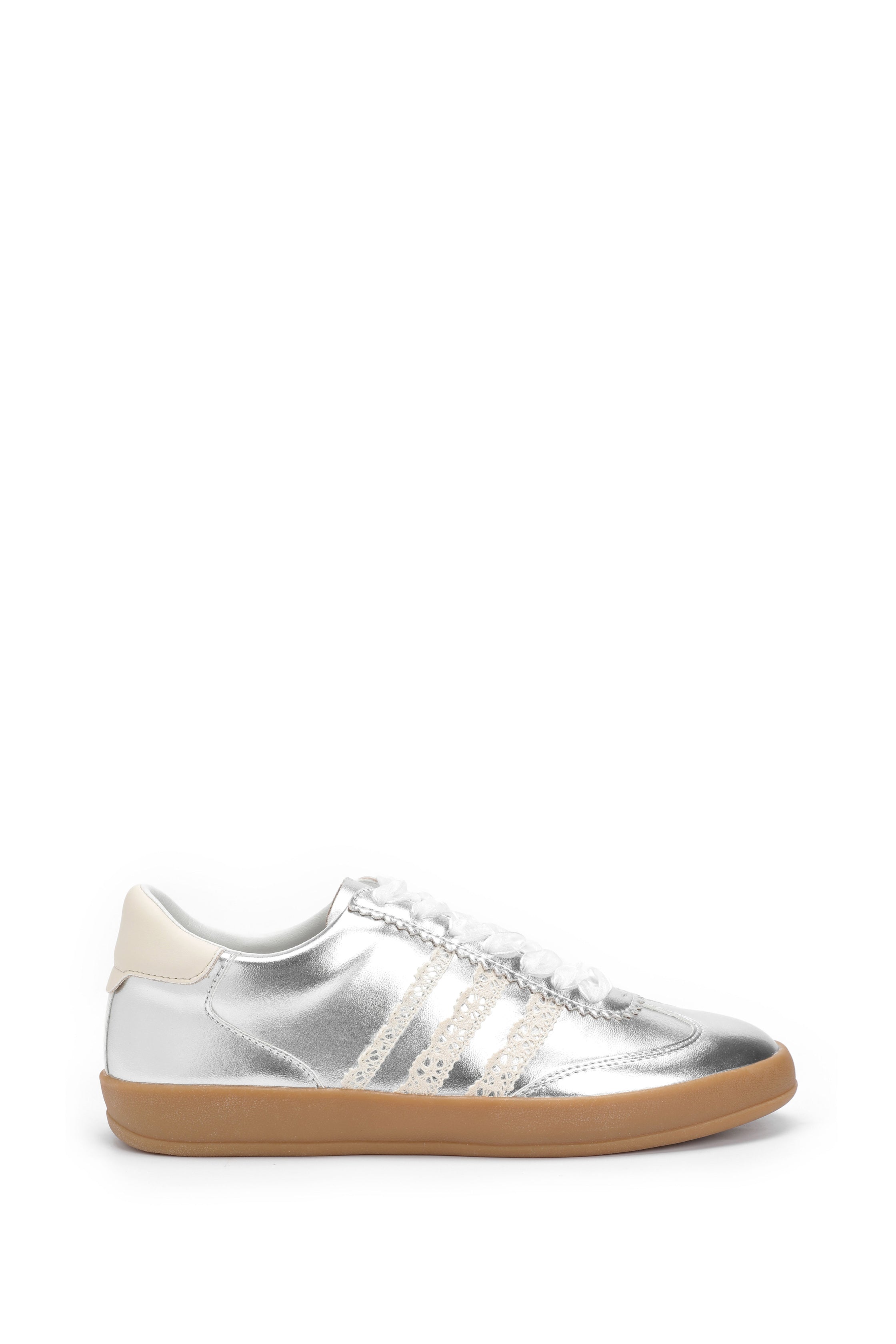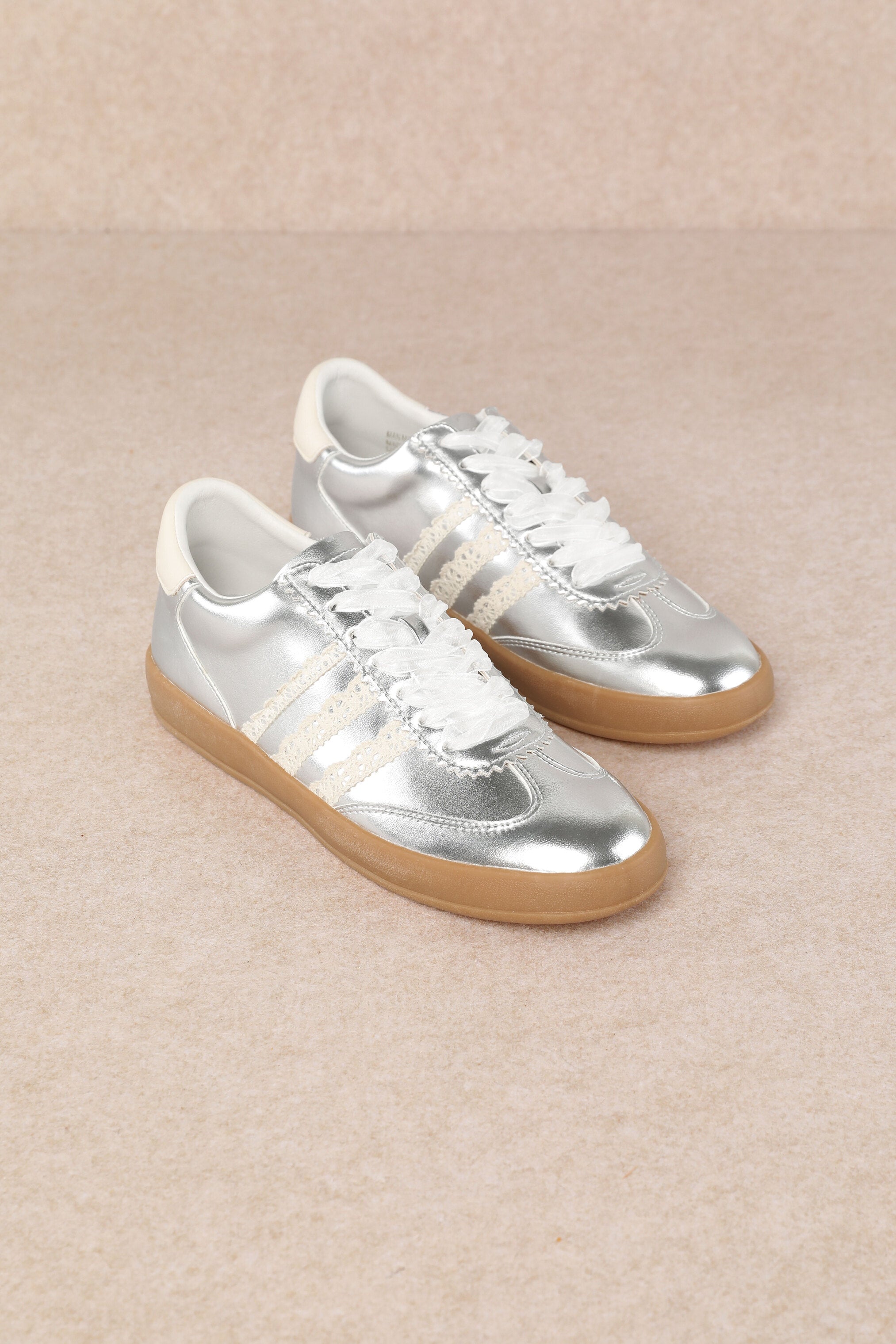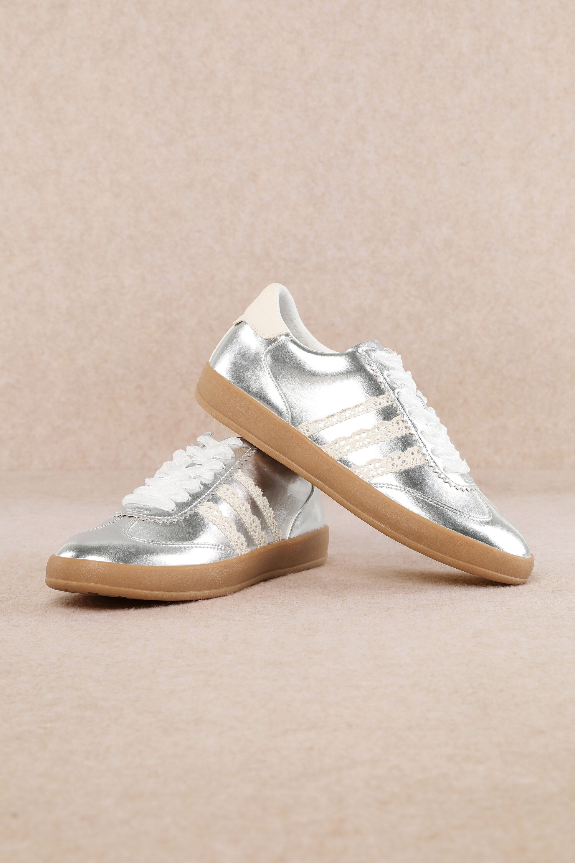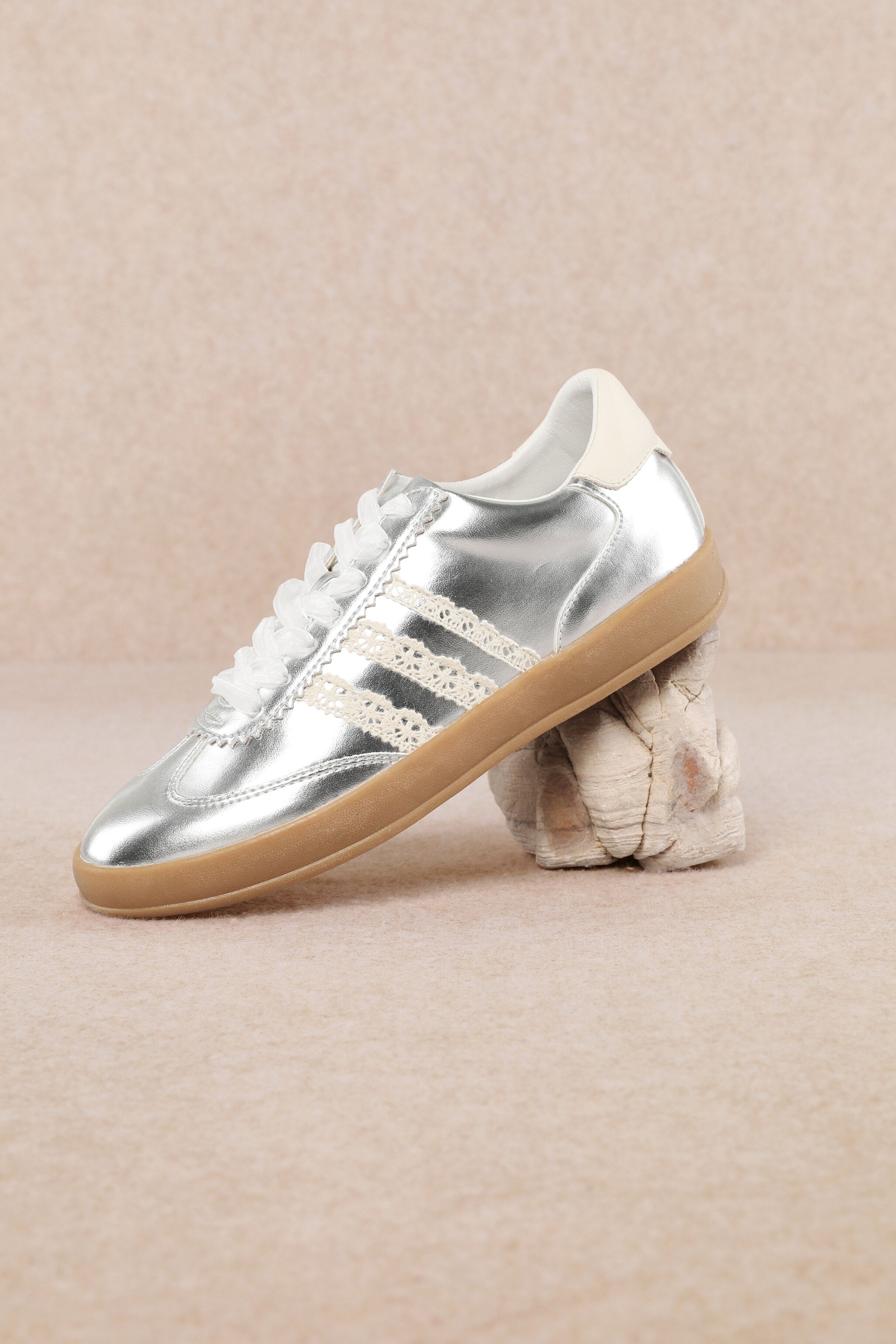 Shine with every step in the Didi Metallic Lace Sneaker. Featuring a polished silver finish contrasted with creamy accents, this standout sneaker blends sporty design with feminine charm. The side stripes are reimagined in delicate lace for a subtle romantic touch, while the classic gum sole keeps it grounded and versatile. Perfect for pairing with casual denim, playful skirts, or even tailoring for a chic twist, the Didi delivers comfort with a luminous edge.