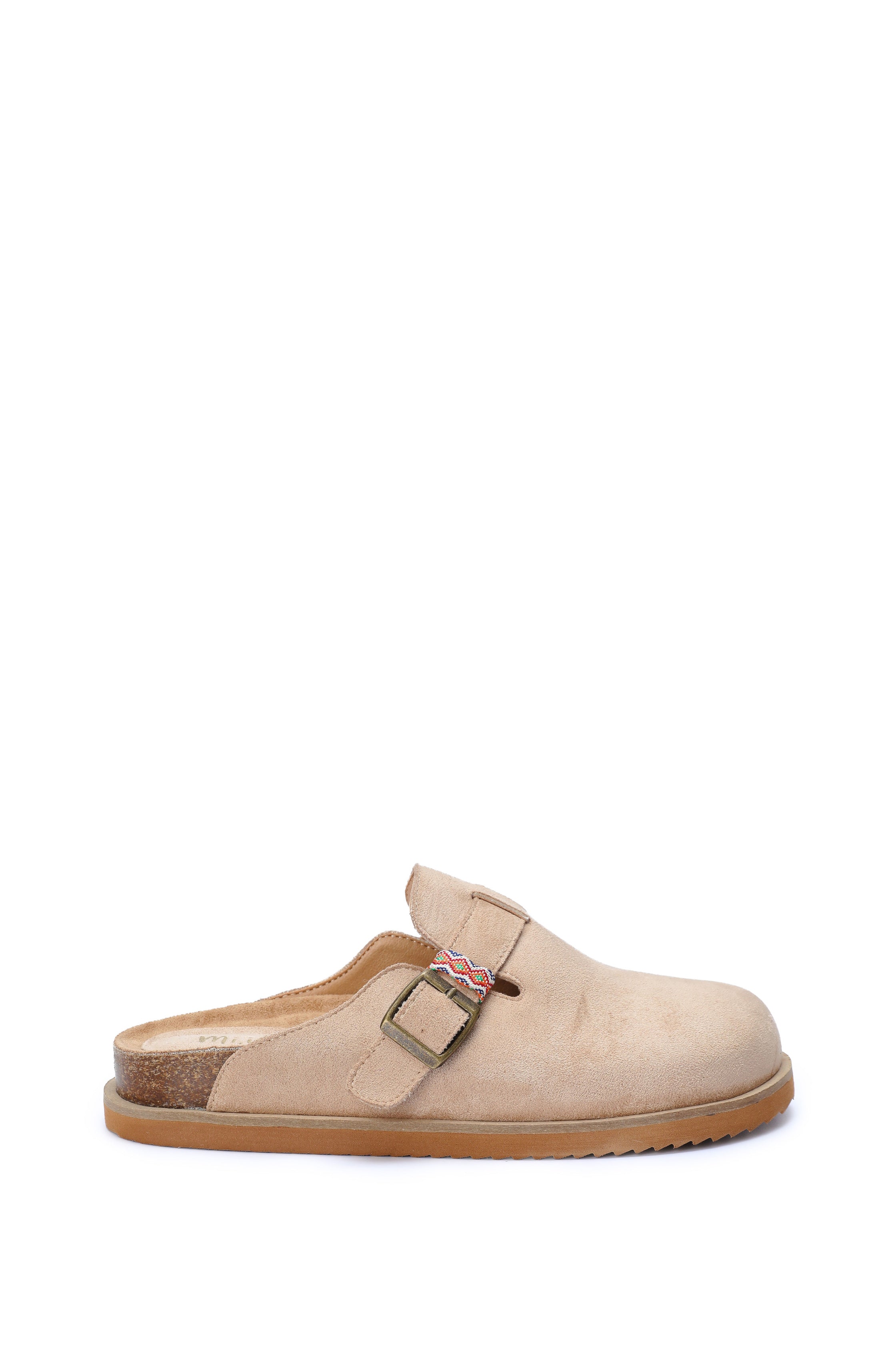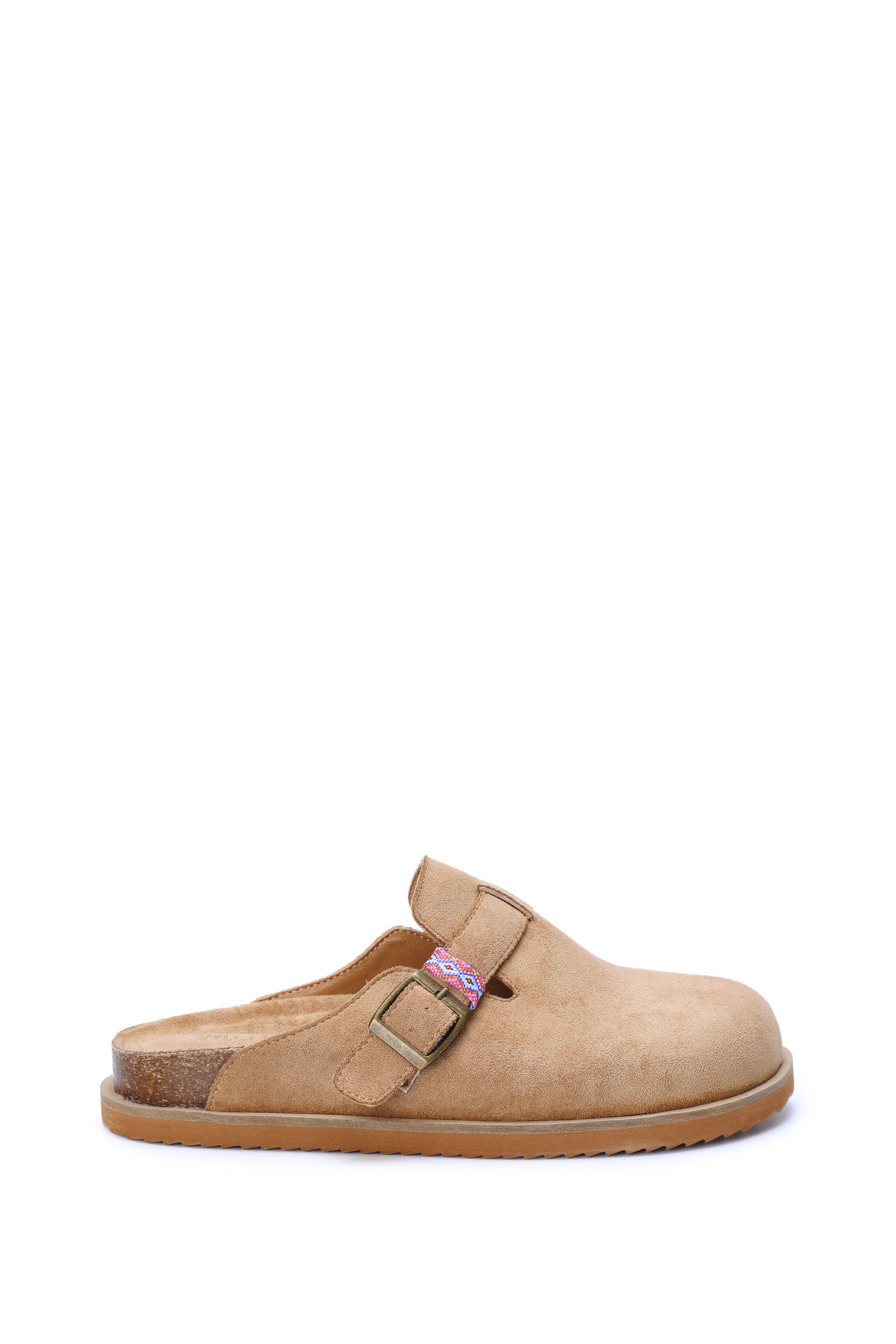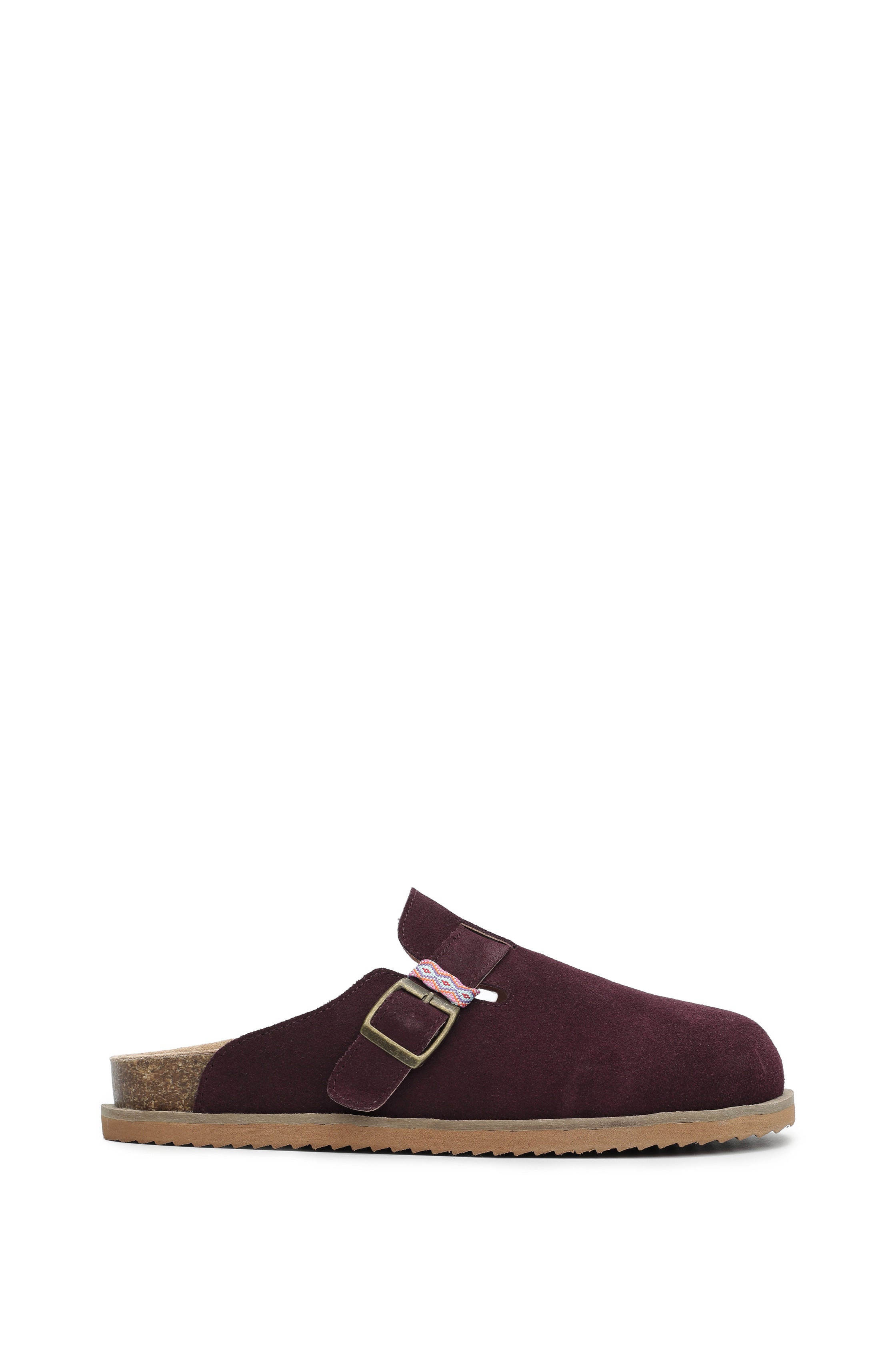 Suede mule with round toe, adjustable brass buckle, and woven accent strap. Features contoured cork footbed and flexible sole for all-day comfort—perfect with denim, dresses, or loungewear.