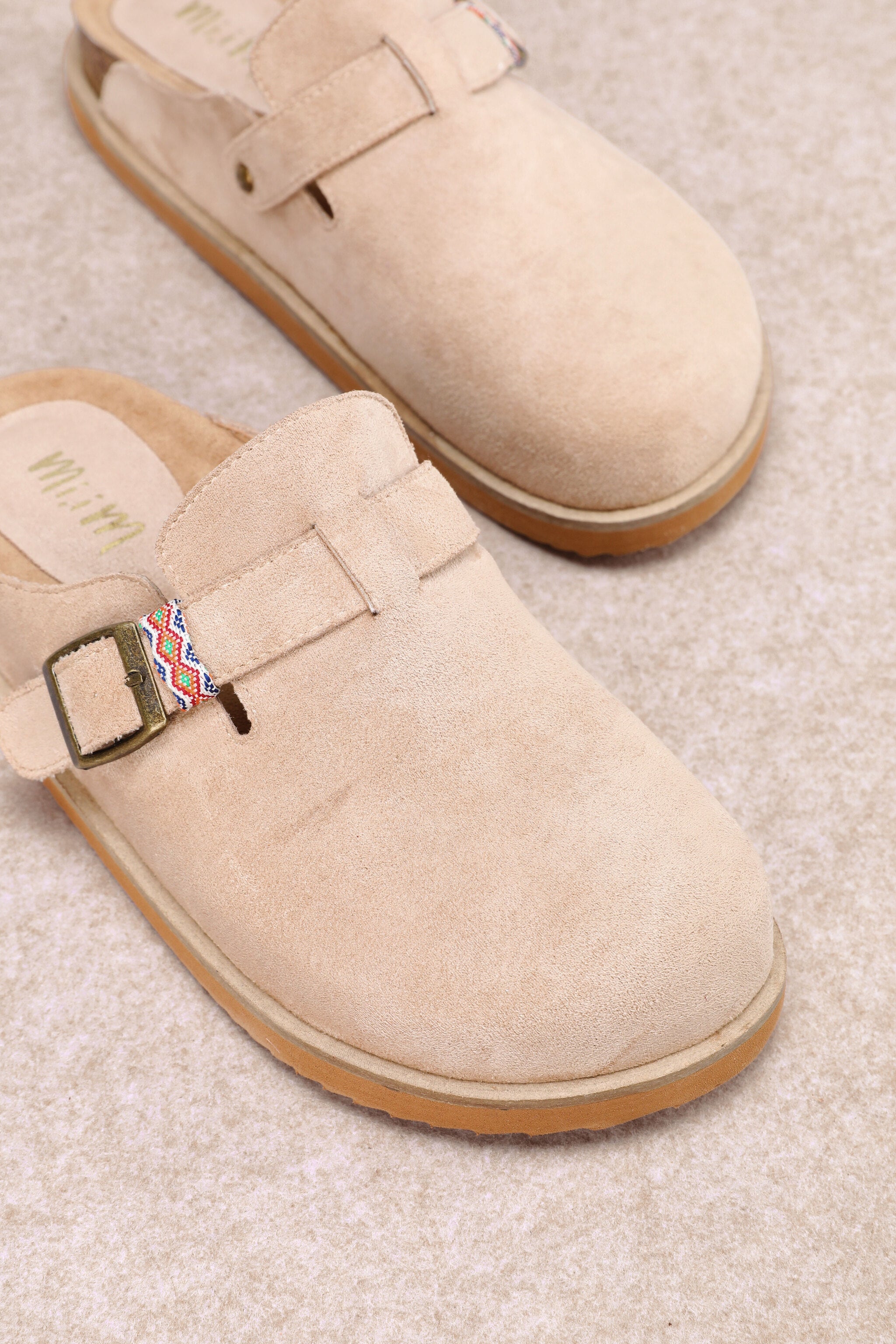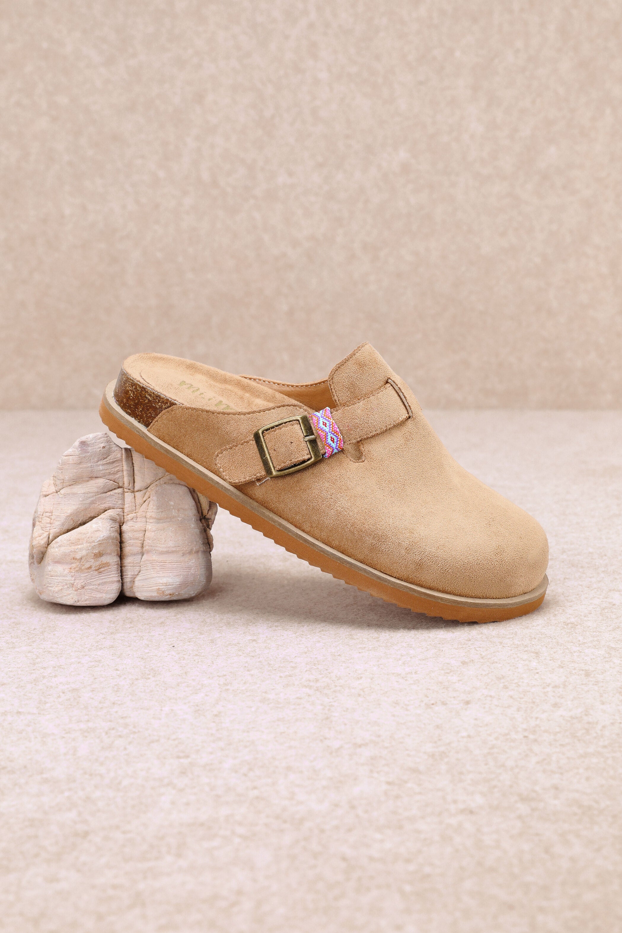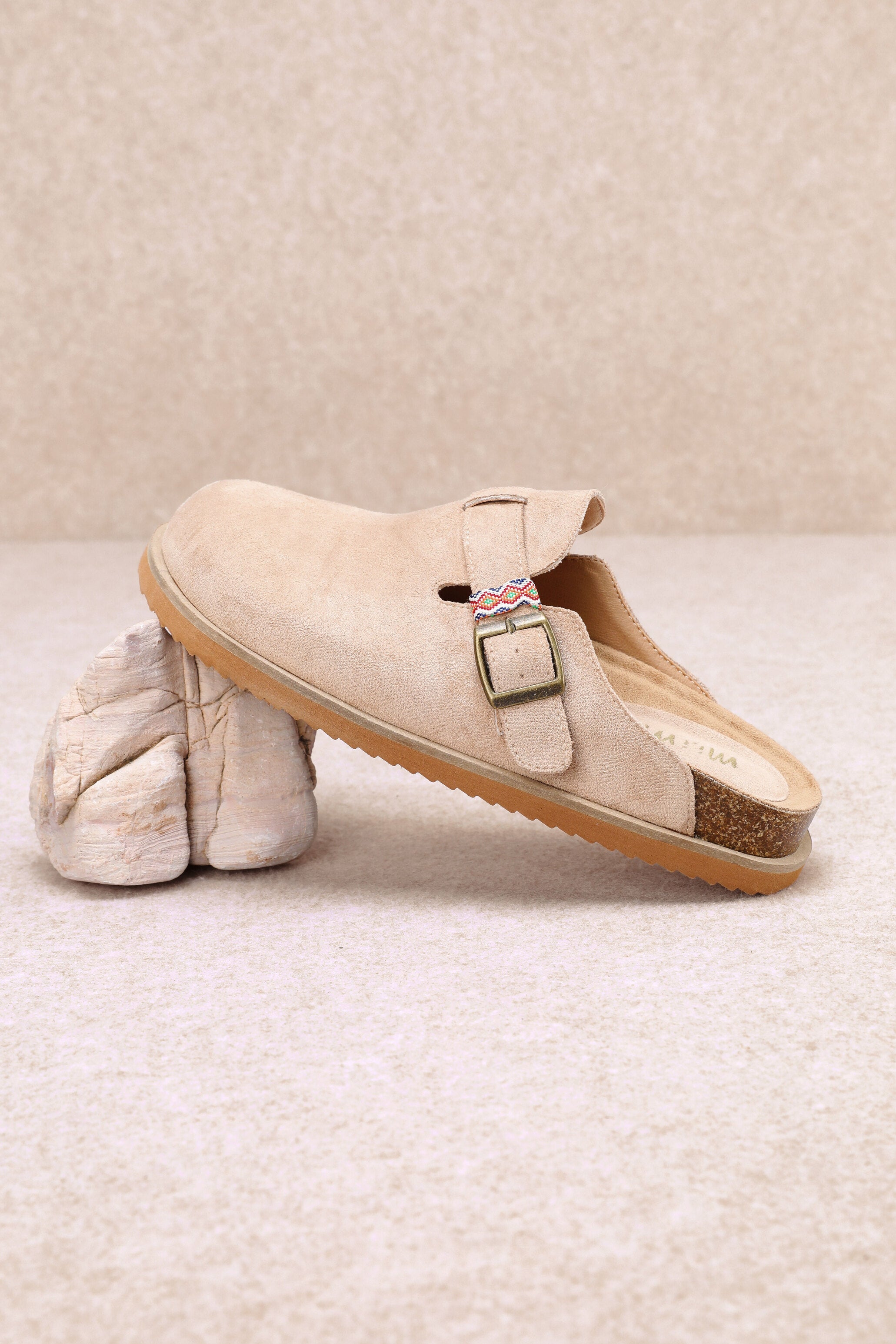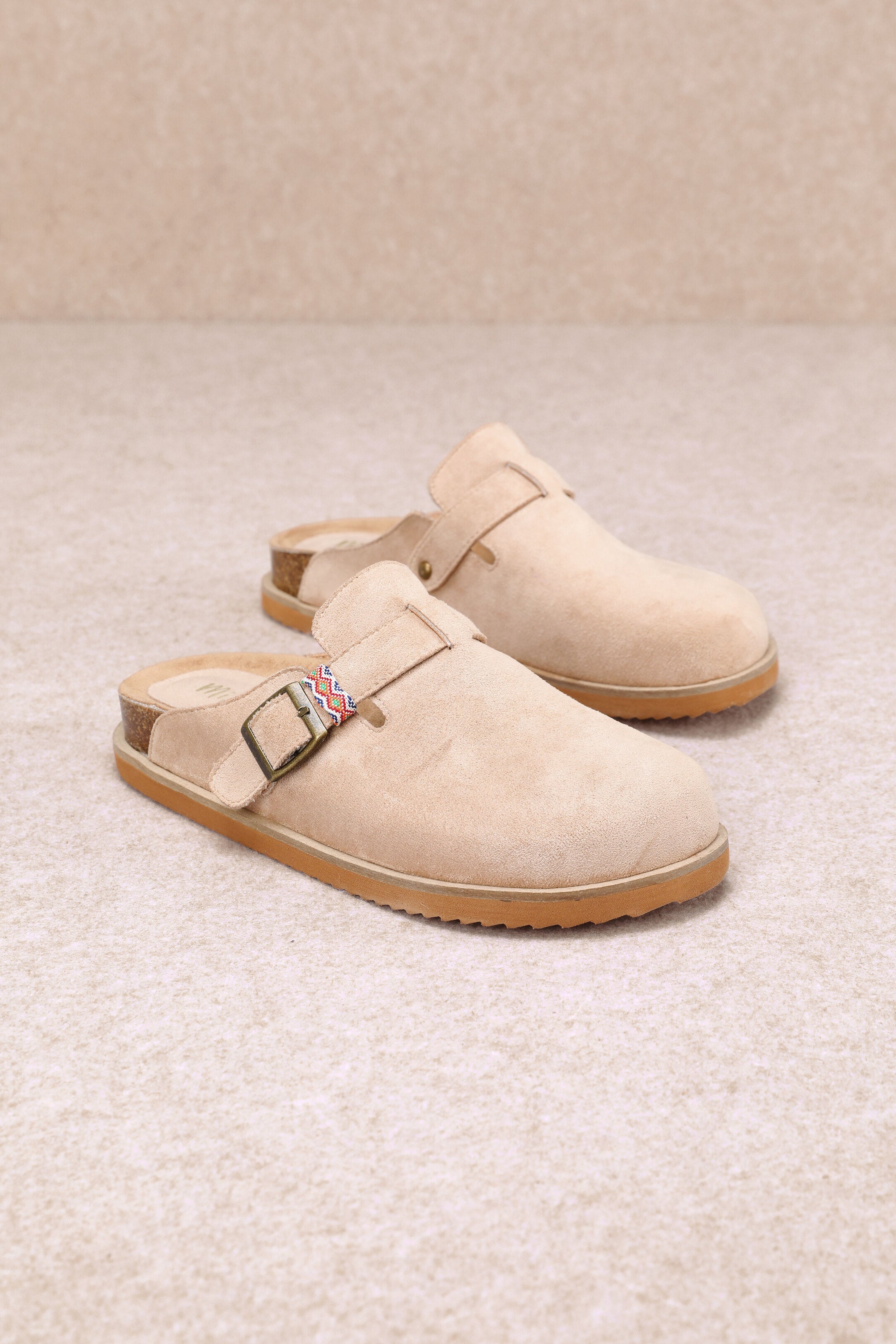 Suede mule with round toe, adjustable brass buckle, and woven accent strap. Features contoured cork footbed and flexible sole for all-day comfort—perfect with denim, dresses, or loungewear.